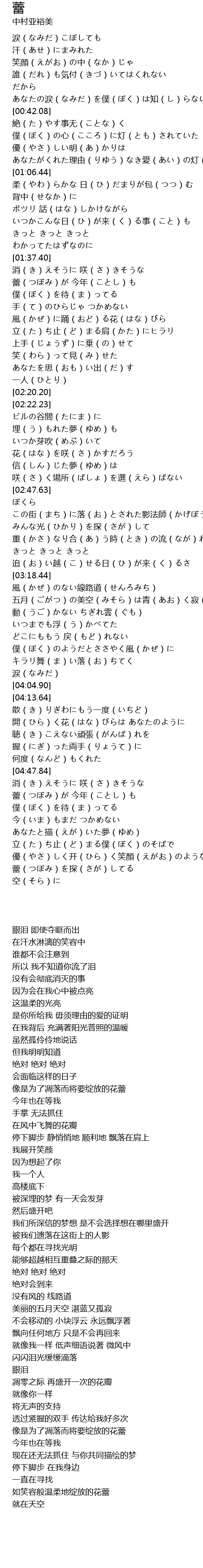 | [01:44.42] | 蕾(つぼみ)が 今年(ことし)も 僕(ぼく)を待(ま)ってる |