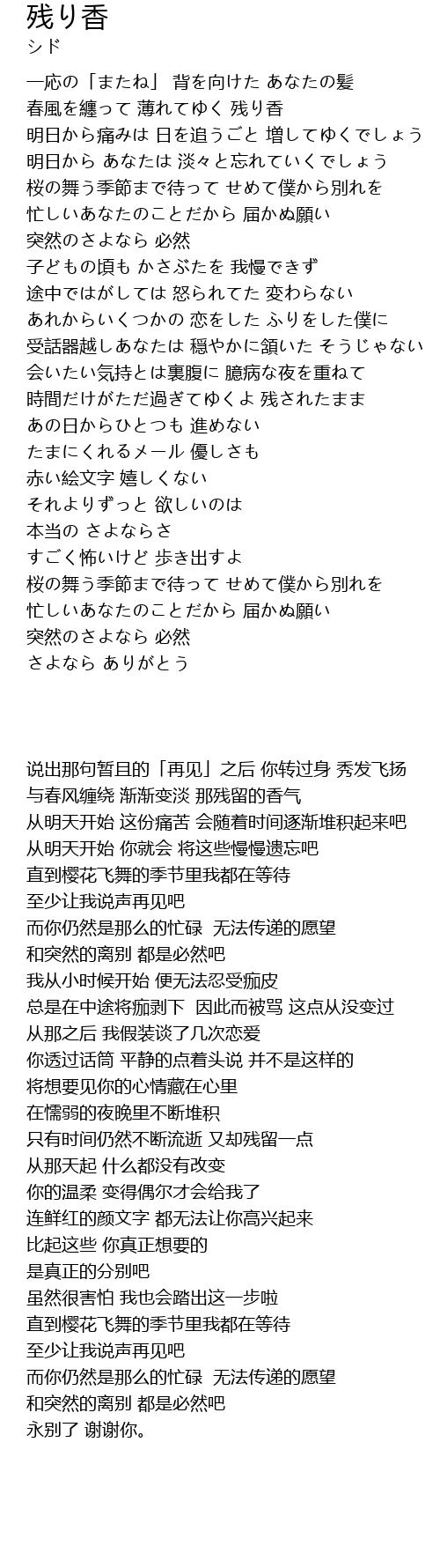 | [00:38.270] | 春風を纏って 薄れてゆく 残り香 |