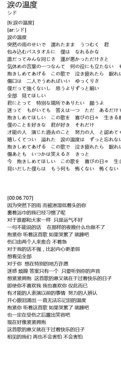 | [03:43.346] | 嬉しくてつい 溢れた 涙の温度は ずっと忘れない |