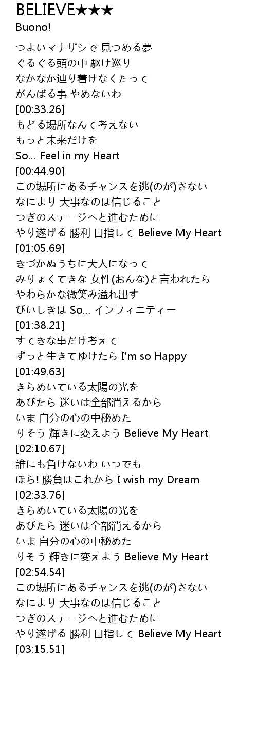| [03:10.22] | やり遂げる 勝利 目指して Believe My Heart |