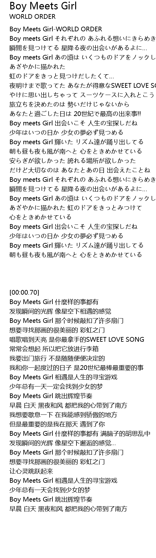 | [00:00.70] | Boy Meets Girl-WORLD ORDER |