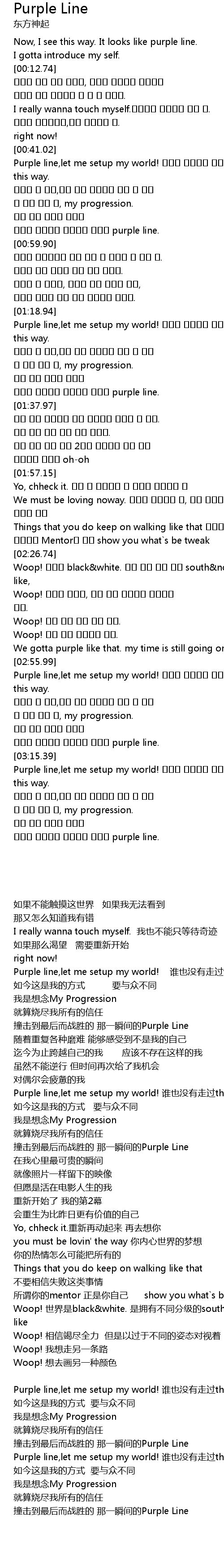 | [02:56.61] | Purple line,let me setup my world! 누구도 걸어보지 못했던 this way. |