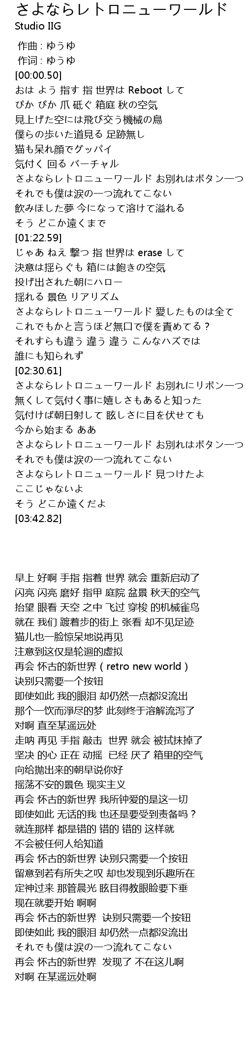 | [03:29.34] | さよならレトロニューワールド 見つけたよ ここじゃないよ |