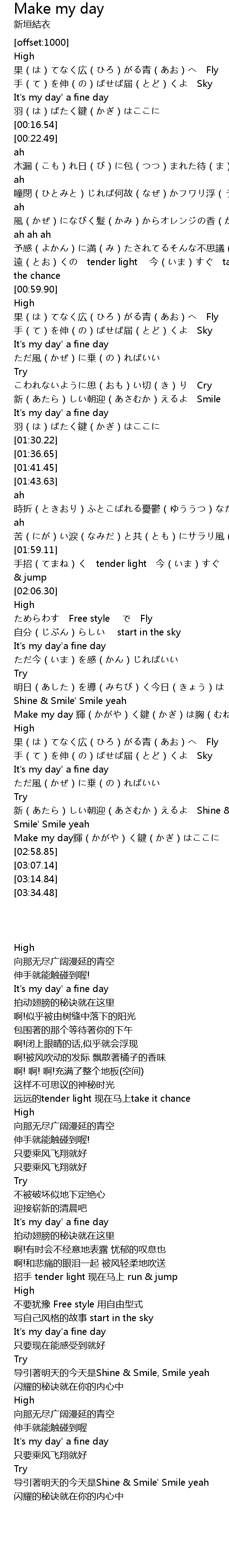 | [02:28.76] | Make my day 輝(かがや)く鍵(かぎ)は胸(むね)に |