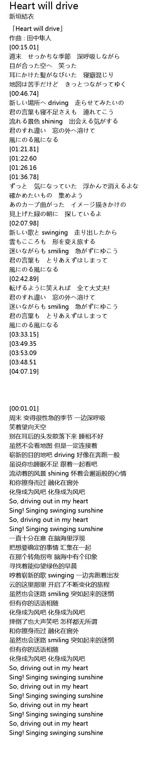 | [00:01.01] | 「Heart will drive」 |