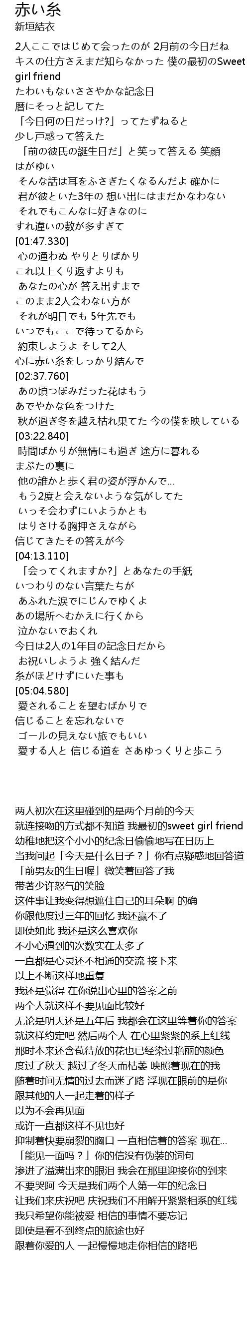 | [02:35.950] | 約束しようよ そして2人 心に赤い糸をしっかり結んで |