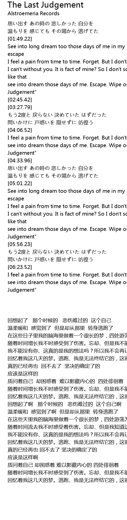 | [05:42.72] | see into dream those days of me. Escape. Wipe out I Can't it. My "Last Judgement" |
