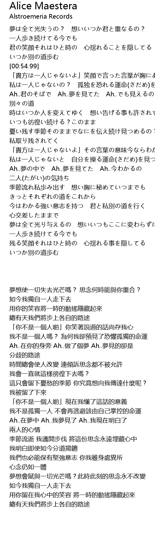 | [01:21.38] | 「貴方は一人じゃないよ」笑顔で言った言葉が胸にある |