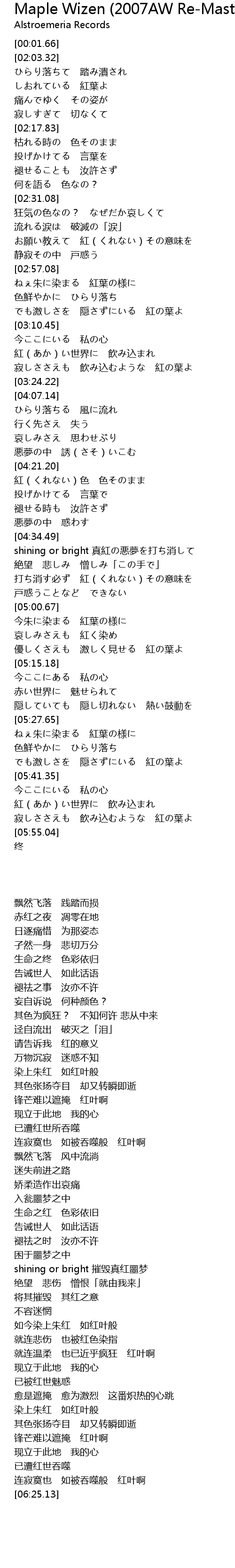 | [05:50.34] | 寂しささえも 飲み込むような 紅の葉よ |