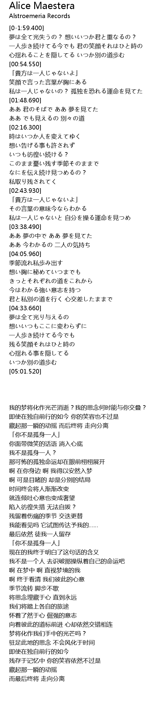 | [01:35.000] | 私は一人じゃないの? 孤独を恐れる運命を見てた |