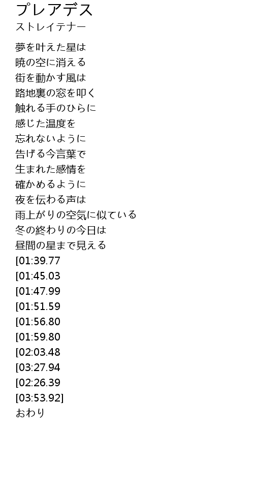 | [03:39.73][03:27.94][02:13.86] | WE MAKE A WISH UPON THE PLEIADES |