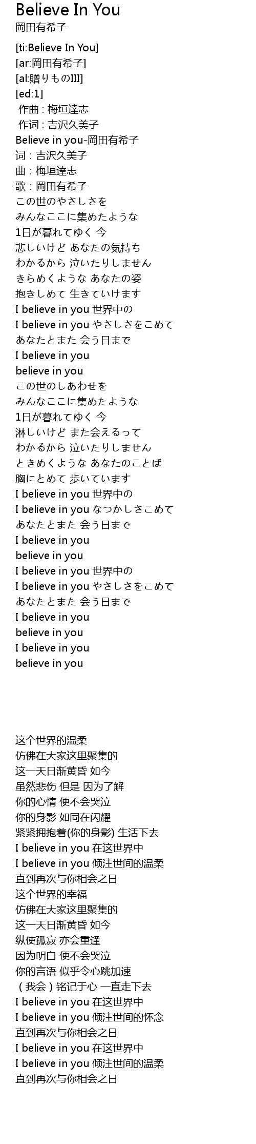 | [00:00.910] | Believe in you-岡田有希子 |