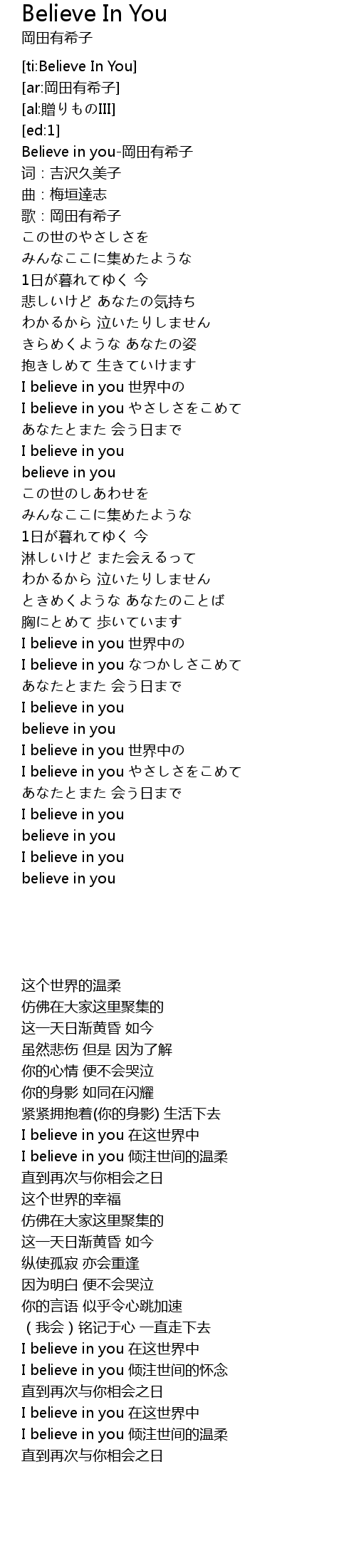 | [00:00.910] | Believe in you-岡田有希子 |
