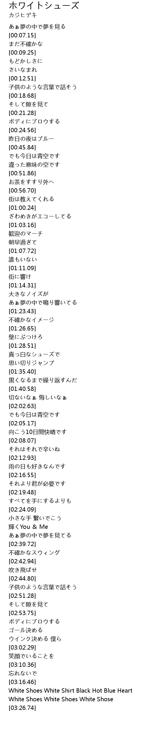 | [03:22.35] | White Shoes White Shirt Black Hot Blue Heart |