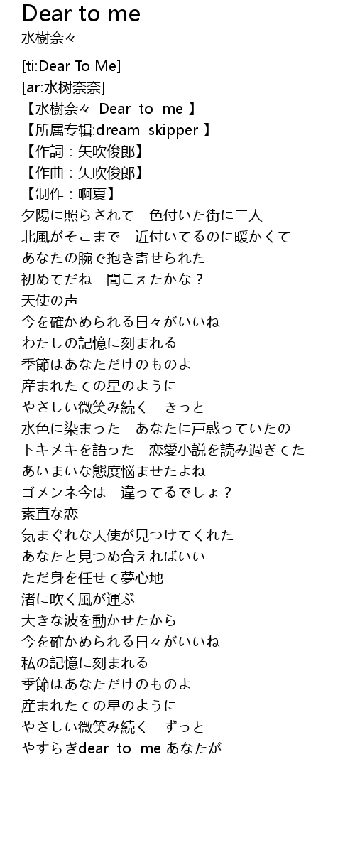 | [00:01.35] | 【水樹奈々-Dear to me 】 |