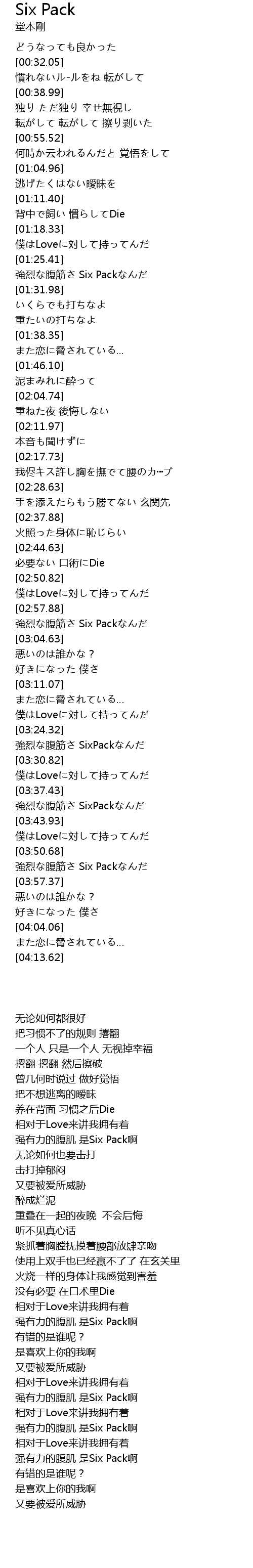 | [03:52.49] | qiáng liè fù jīn Six Pack |