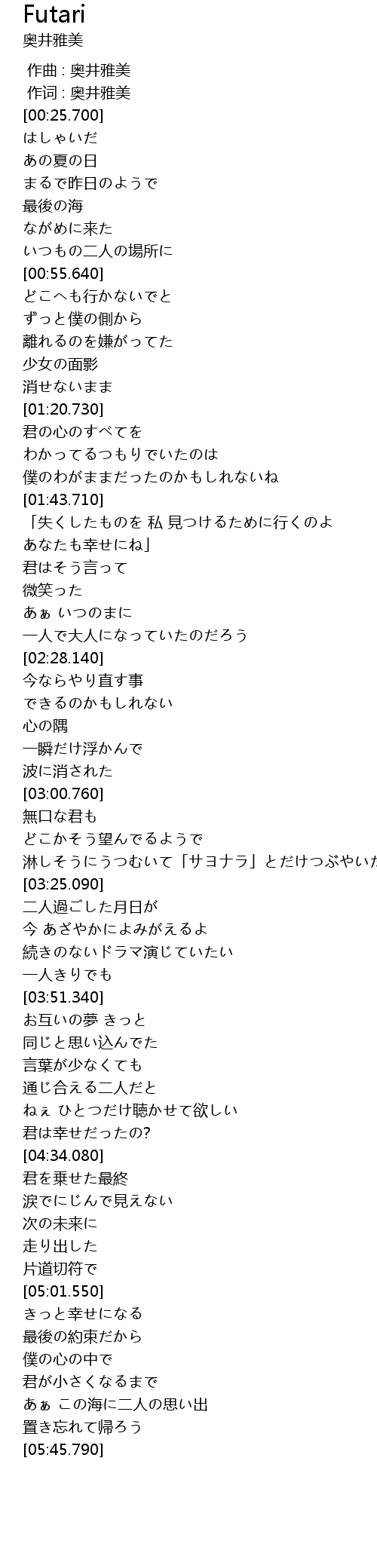 | [05:29.480] | あぁ この海に二人の思い出 |