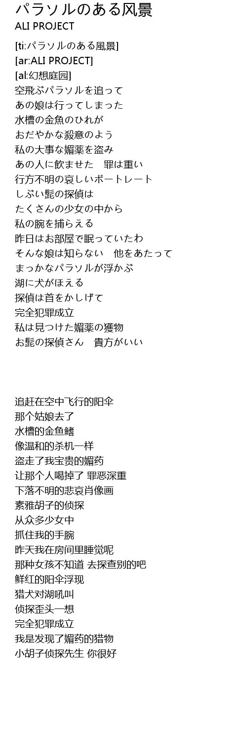 | [00:15.14] | 空飛ぶパラソルを追って |