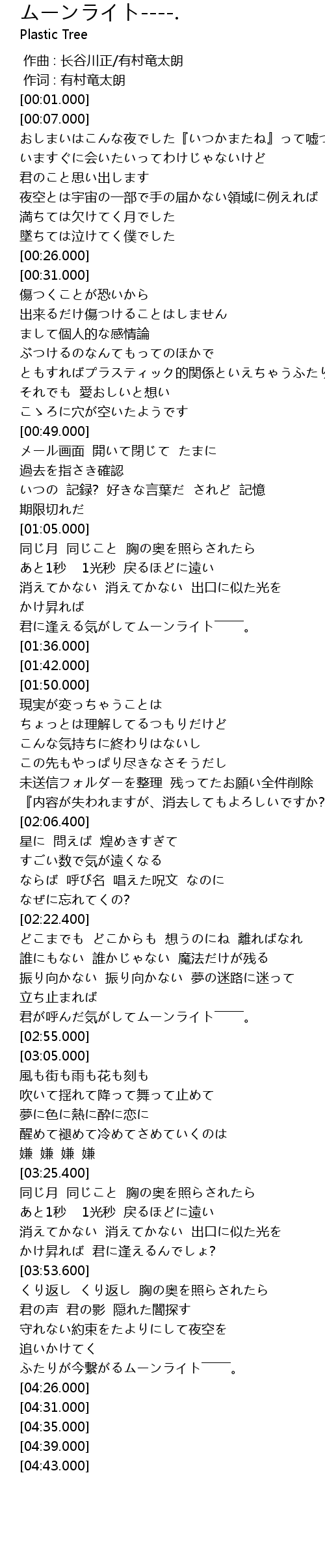 | [02:45.500] | 立ち止まれば 君が呼んだ気がしてムーンライト―――――。 |