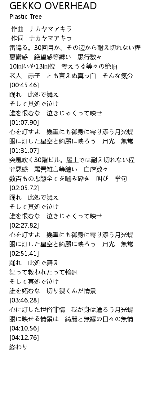 | [01:08.53] | 心を灯すよ 幾重にも御身に寄り添う月光蝶 |