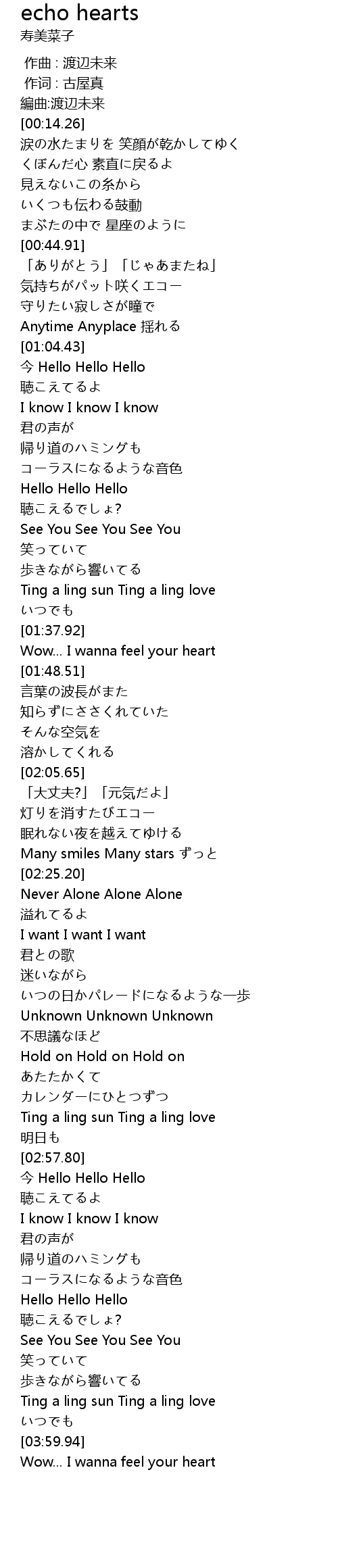 | [02:05.99] | 「大丈夫?」「元気だよ」 |