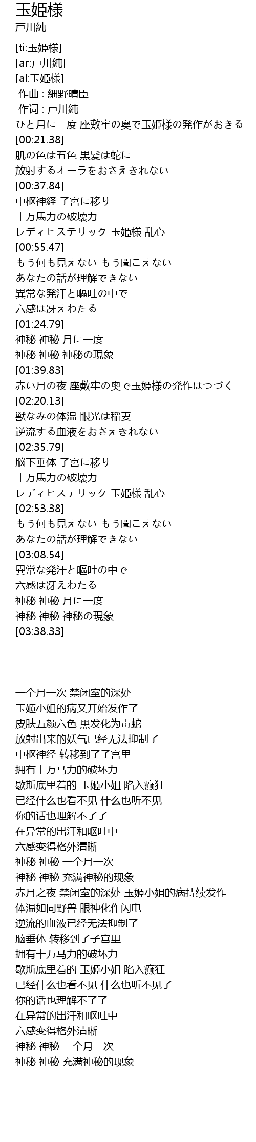 | [02:05.84] | 赤い月の夜 座敷牢の奥で玉姫様の発作はつづく |
