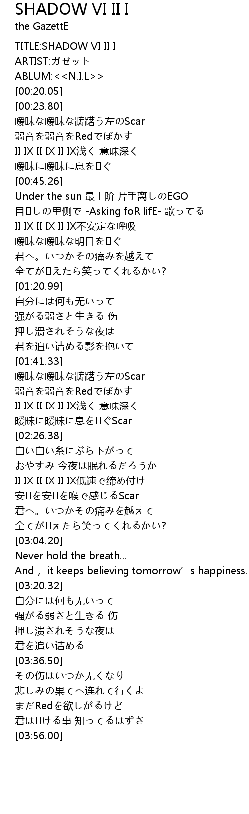 | [00:04.11] | TITLE:SHADOW VI II I |