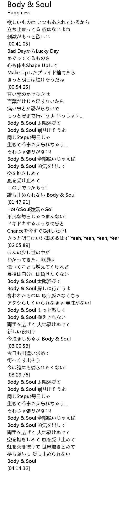 | [01:17.53] | Body & Soul 踊り出そうよ |