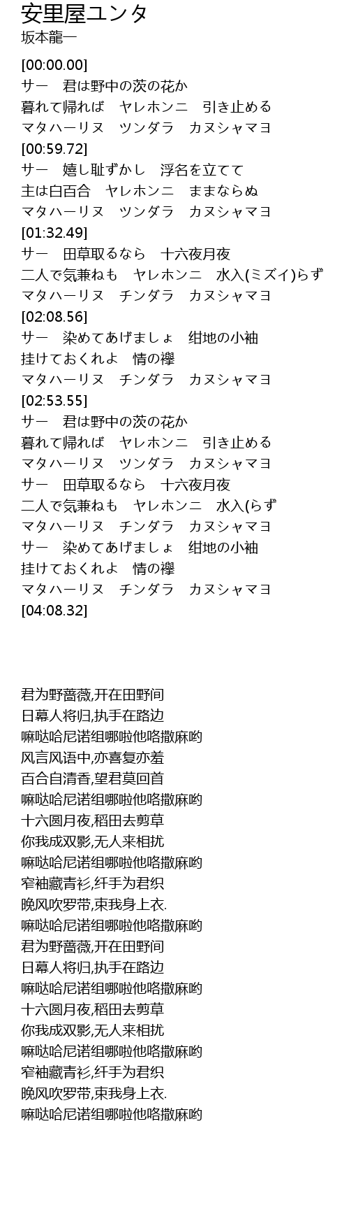 | [00:53.70] | マタハーリヌ ツンダラ カヌシャマヨ |