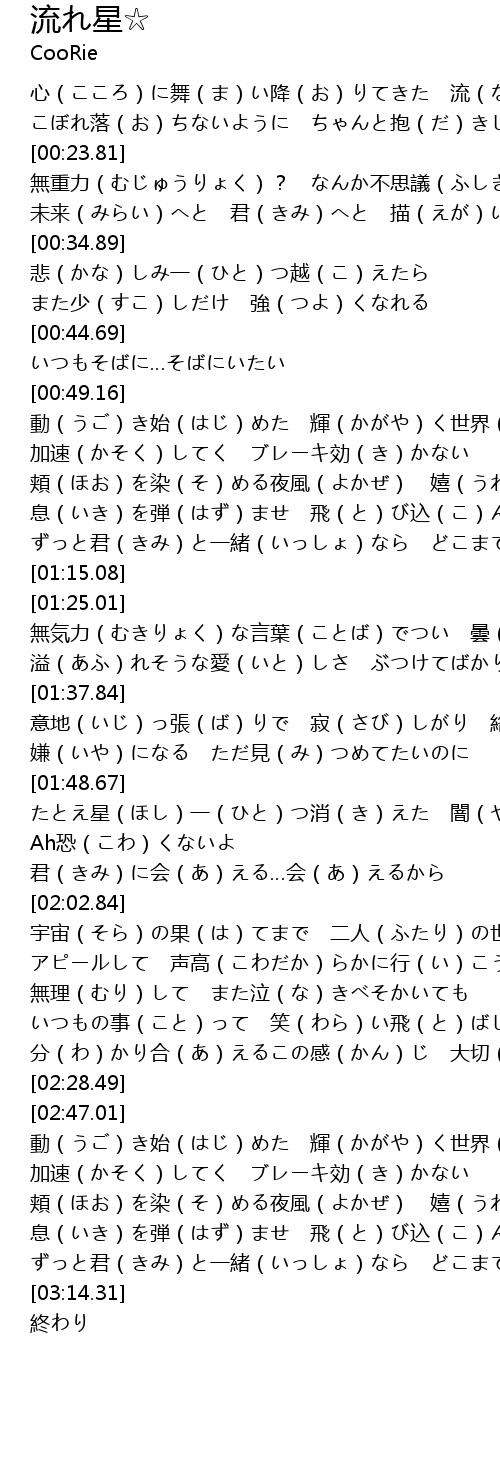 | [02:03.14] | 宇宙(そら)の果(は)てまで 二人(ふたり)の世界(せかい) |