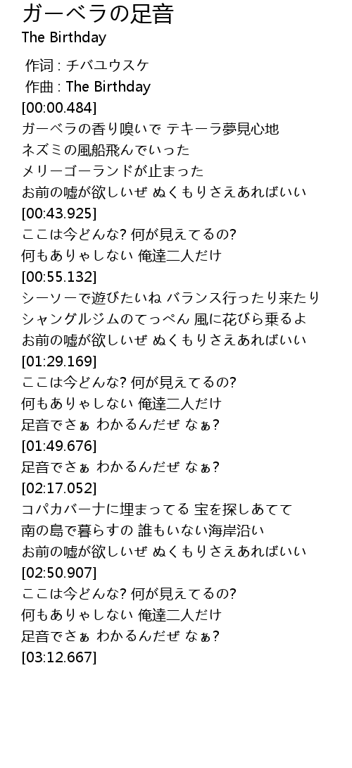| [00:18.534] | ガーベラの香り嗅いで テキーラ夢見心地 |