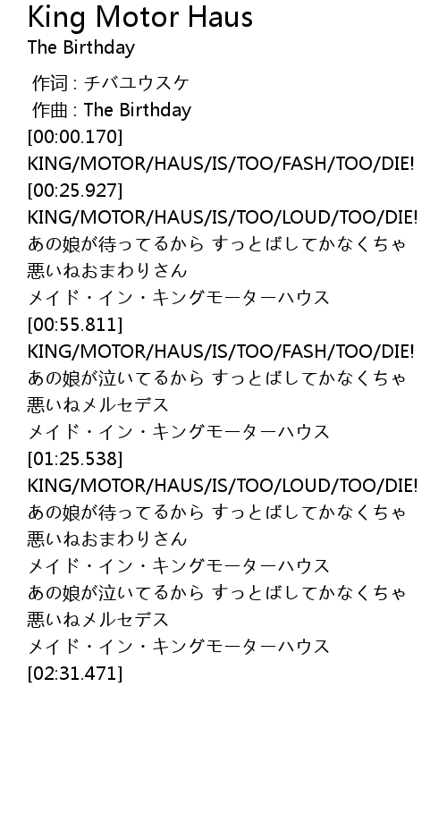| [02:01.248] | KING/MOTOR/HAUS/IS/TOO/LOUD/TOO/DIE! |