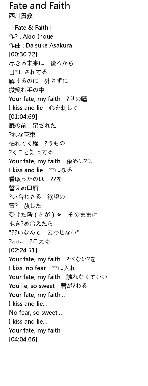 | [01:36.55] | Your fate, my faith 歪めば?は |