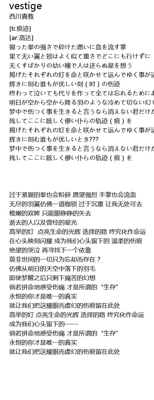 | [02:39.973] | 残してここに眩しく儚い仆らの轨迹(痕)を |