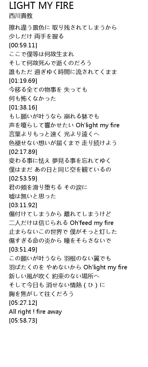 | [04:52.12] | 羽ばたくのを やめないから Oh'light my fire |