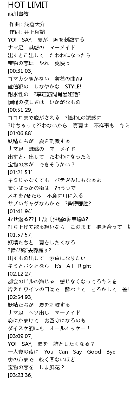 | [00:58.72] | ?けちゃって??わないから 真夏は 不祥事も キミ次第で |