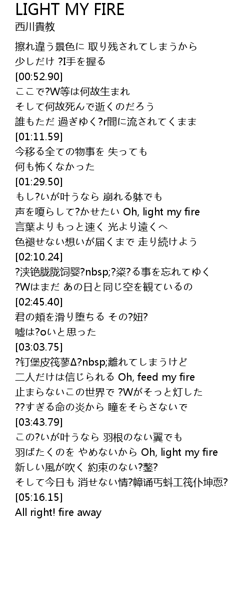 | [01:38.86] | 声を嗄らして?かせたい Oh, light my fire |