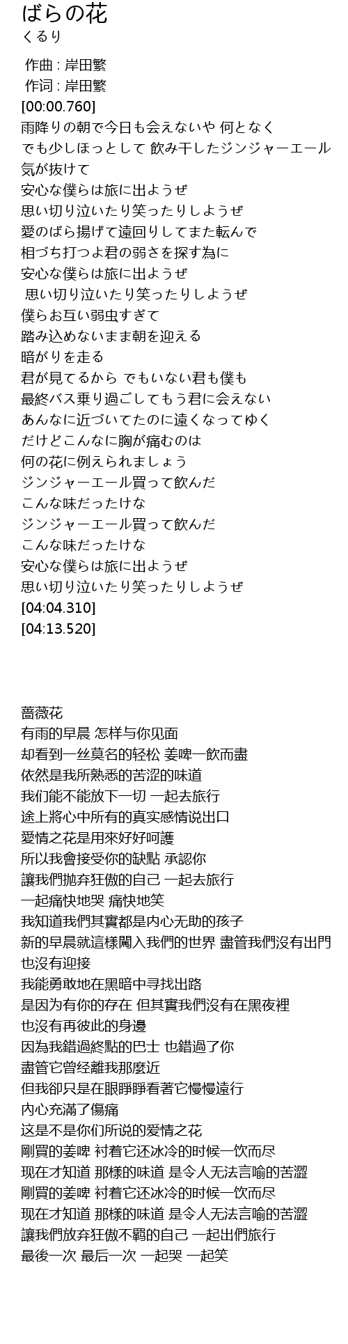 | [01:32.210] | 愛のばら揚げて遠回りしてまた転んで |