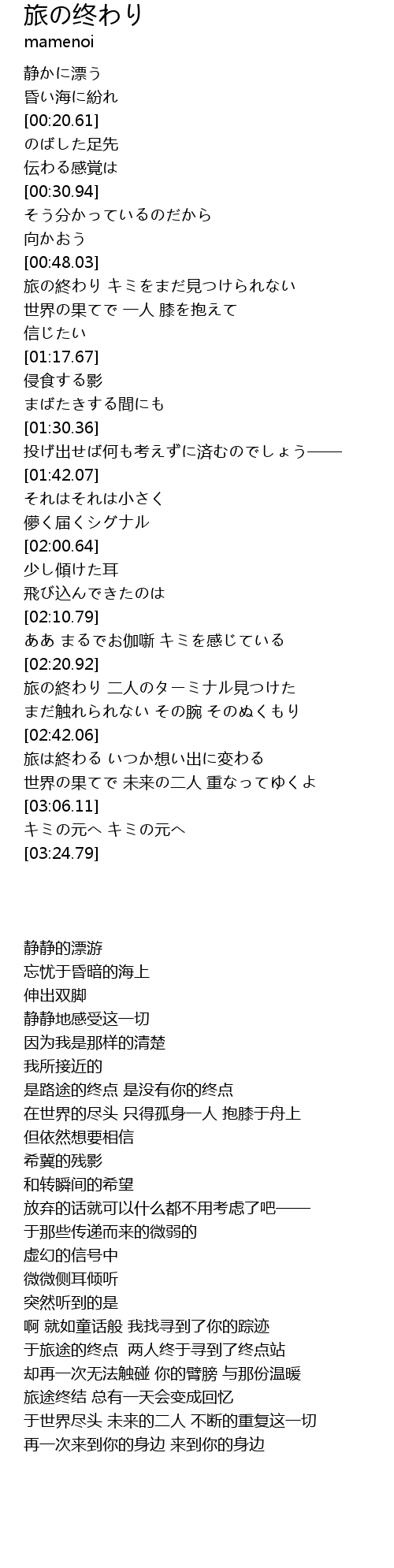 | [00:49.12] | 旅の終わり キミをまだ見つけられない |