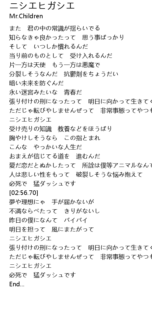 | [04:10.31] | ニシエヒガシエ |