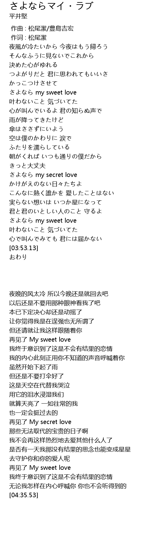 | [00:38.83] | 夜風が冷たいから 今夜はもう帰ろう |