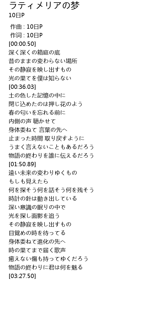 | [03:16.88] | 物語の終わりに君は何を魅る |