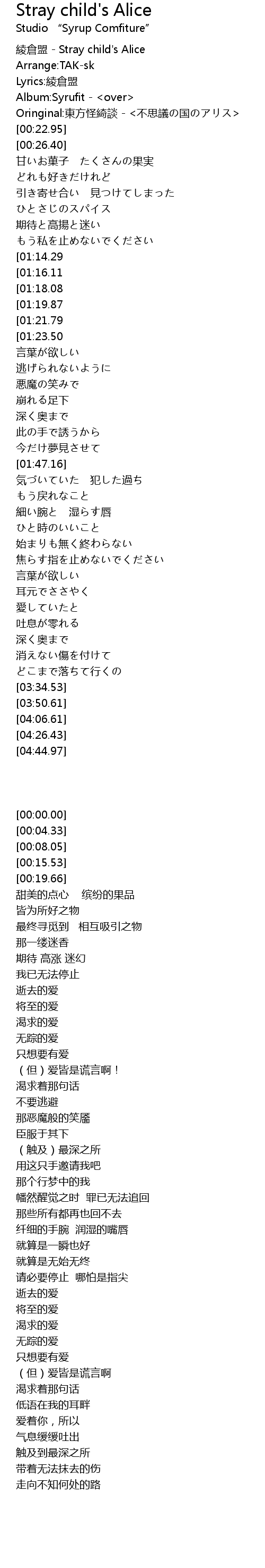 | [00:00.00] | 綾倉盟 - Stray child's Alice |