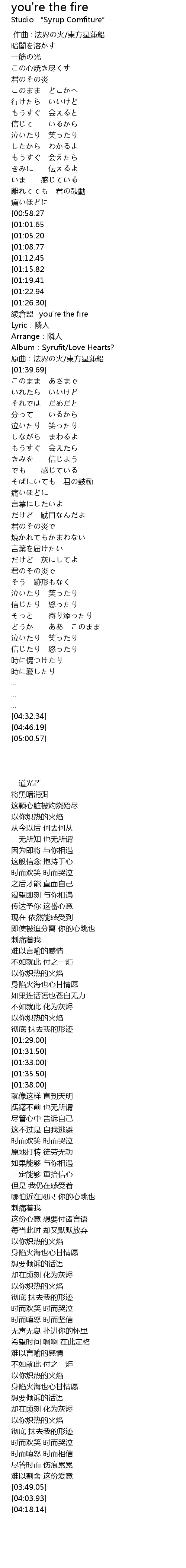 | [01:29.00] | 綾倉盟 -you're the fire |