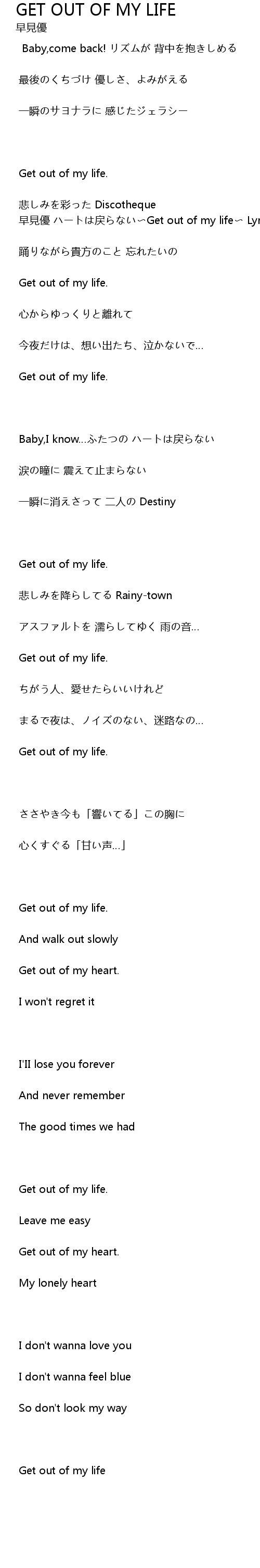 | 早見優 ハートは戻らない〜Get out of my life〜 Lyrics | |