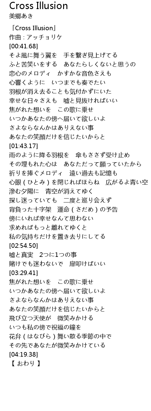 | [00:01.68] | 「Cross Illusion」 |