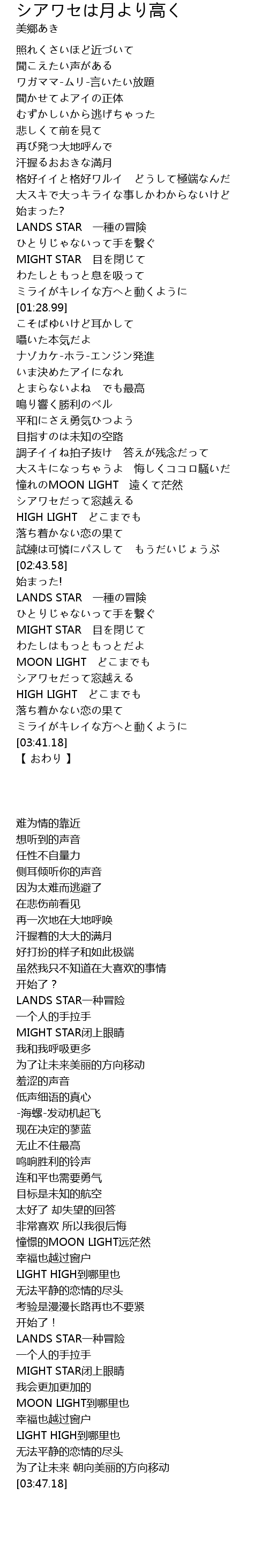 | [02:18.01] | 憧れのMOON LIGHT 遠くて茫然 |