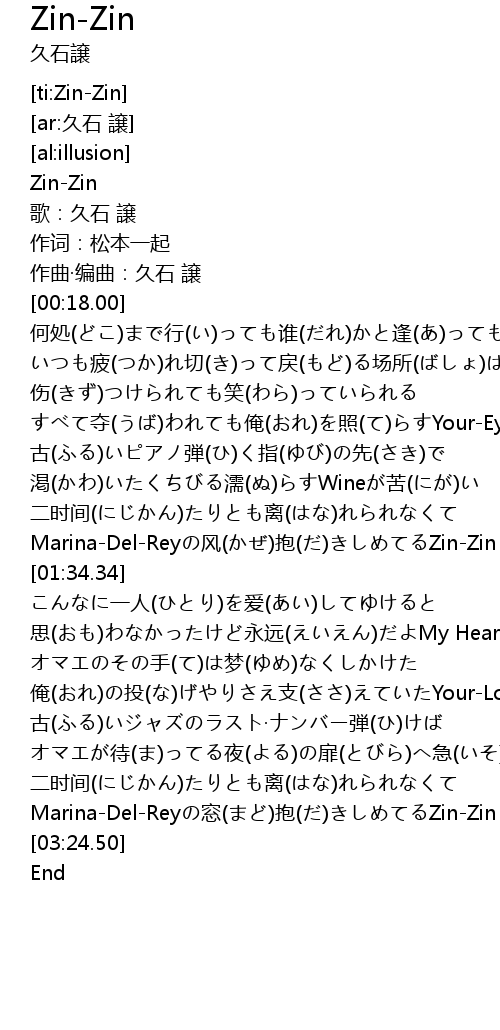 | [03:14.56] | Marina-Del-Reyの窓(まど)抱(だ)きしめてるZin-Zin |