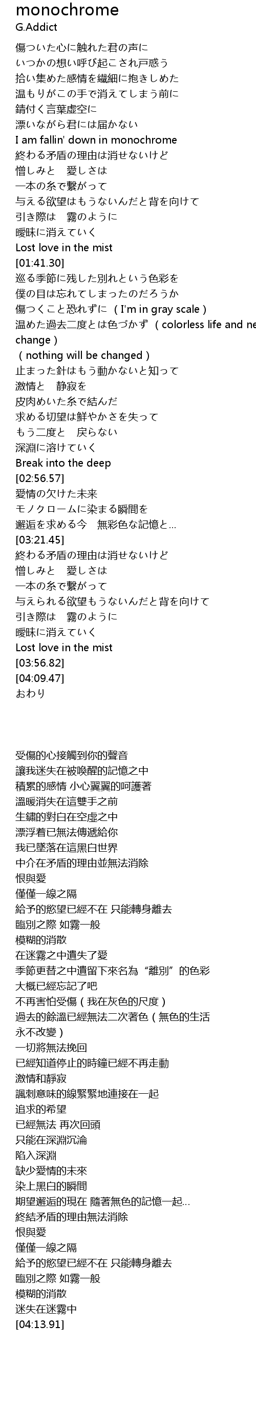 | [01:05.67] | I am fallin' down in monochrome |