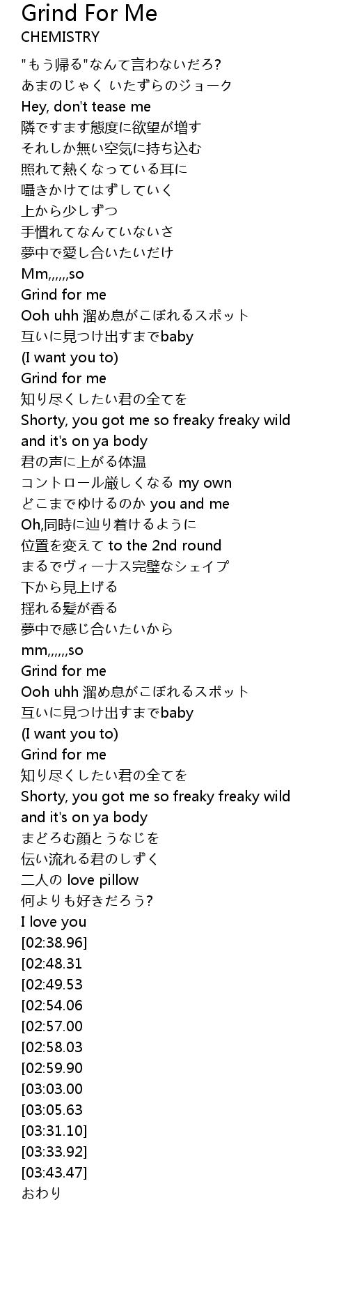 | [03:22.81][03:03.00] | Shorty, you got me so freaky freaky wild |